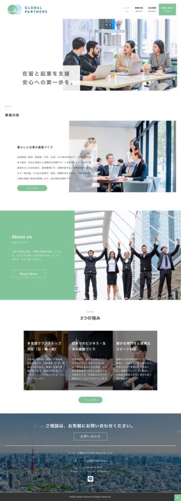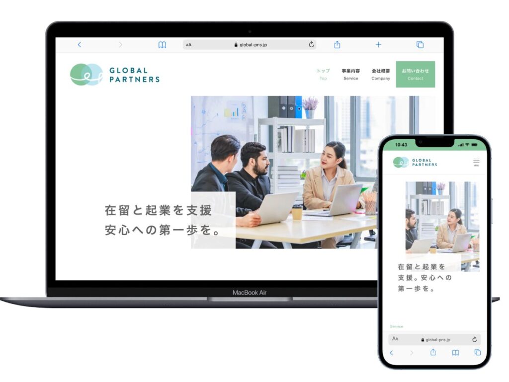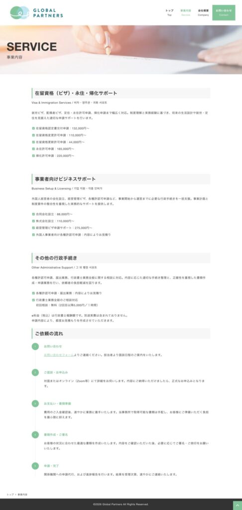 GLOBAL PARTNERS様 投稿日 2026年1月15日 更新日 2026年4月15日 著者 wataru カテゴリー 未分類 制作事例 制作事例 GLOBAL PARTNERS様 サイト種別コーポレートサイト業種行政書士事務所制作期間30日 Global Partners在留資格申請・帰化申請から会社設立、経営管理ビザ、各種許認可まで対応。日本語・韓国語・英語で、日本での暮らしと事業の基盤づくりをワンストップで支援します。global-pns.jp 日本人と合わせて、在日外国人のお客様も多いということで、淡い緑をベースとした柔らかいデザインでまとめました。