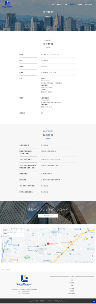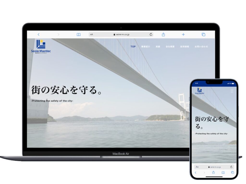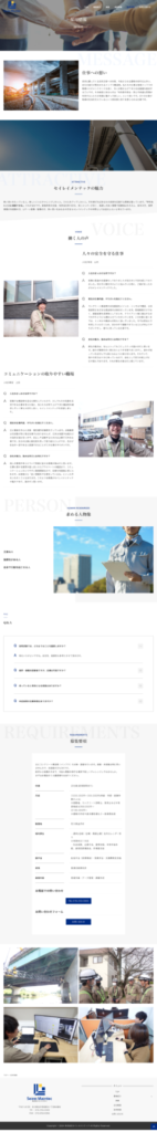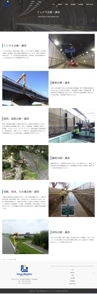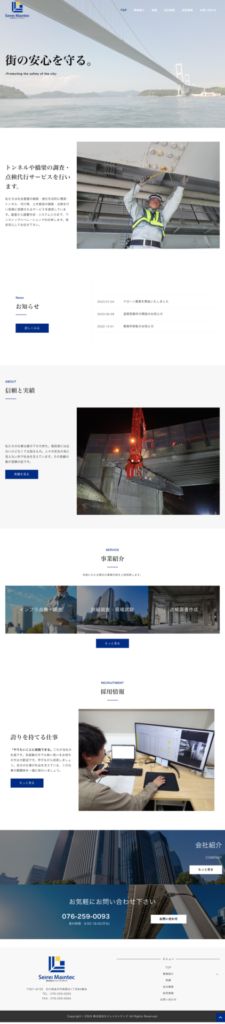 インフラ、建造物の検査を行う会社様のホームページリニューアルをご依頼お任せ頂きました。サイトを開くと最初に大きな橋の動画が現れ、閲覧者に壮大な印象を与えます。採用ページは背景テキストを使用することで心に響くデザインを意識しました。また業務内容が多岐に渡る為、サービスページは画像をシンプルにわかりやすく仕上げております。全体を通して安心して依頼できる、というイメージを印象づけられたかと思います。